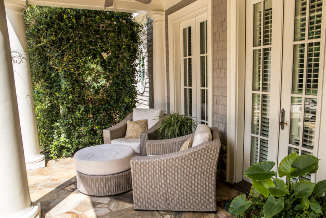 Nothing says comfort like a porch swing, and this one is to die for. The warm wood tones of the ceiling and swing compliment the black paint and greenery beautifully. This homeowner also gets bonus points for the recessed lighting – a great choice! They blend in nicely without detracting from that gorgeous wood ceiling.
