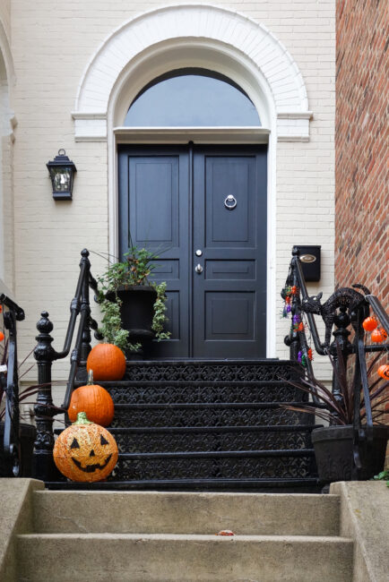 Speaking of Halloween, how can you not love this decor? This porch has just a touch of spooky season, but it can easily be switched out once October ends. Just tuck the jack-o-lantern away and replace the Halloween railing decor with a leafy fall garland, and you’ll have a Thanksgiving-ready porch in no time. The classic black finishes on the stairs, sconce, and door make this house easy to transition between moods and seasons.