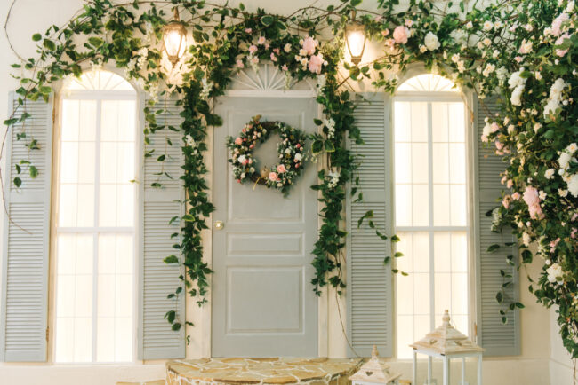This picture is a florist’s dream. Hanging many garlands may be a bit unrealistic, but adding a few flowery garlands (possibly on a railing) and a matching wreath would give a similar result without all the effort!