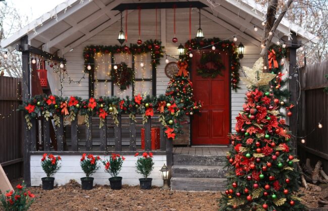 Decorating for the holiday season doesn’t have to be time-consuming or break the bank. Red ribbons on some existing potted plants (faux or real), an elegant wreath, and a garland turn this house into a cozy holiday home without having to battle with your attic storage year after year. This porch is just missing some sconces next to the windows with red ribbons to tie together the look!