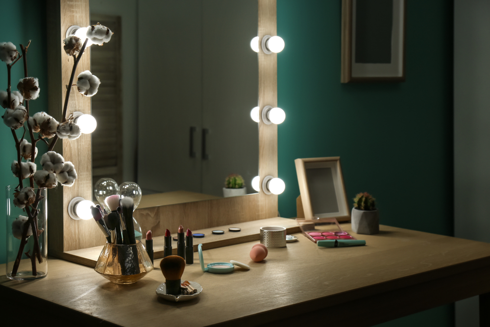 “Face-forward” light shines directly towards your face rather than shining down on you. When your lighting is set up this way, it will reduce false shadows, making it easier to decide where to apply makeup. Many add LEDs around their mirror – it’s is an easy, inexpensive way to customize your makeup table and get the truest lighting for your look.